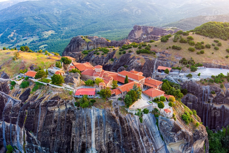 Мегала-Метеора - Великий метеорный монастырь. Панорама высоких скал и гор с монастырями. Доброе утро. Вид с воздуха