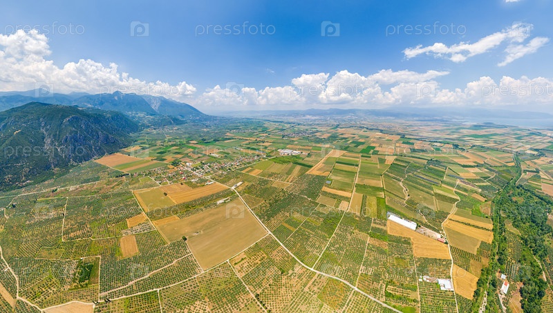 Панорама долины с полями. Оливковые деревья, красочные поля. Лето, облачная погода. Вид с воздуха