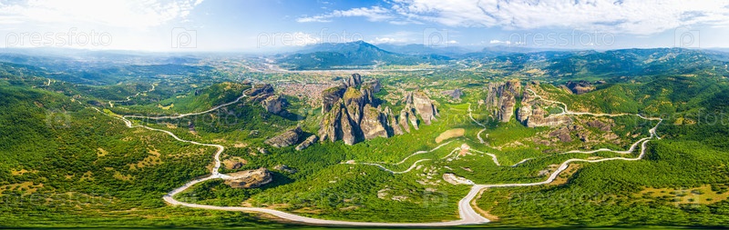 Метеора, Калабака, Греция Панорама высоких скал и гор с монастырями. Панорама 360