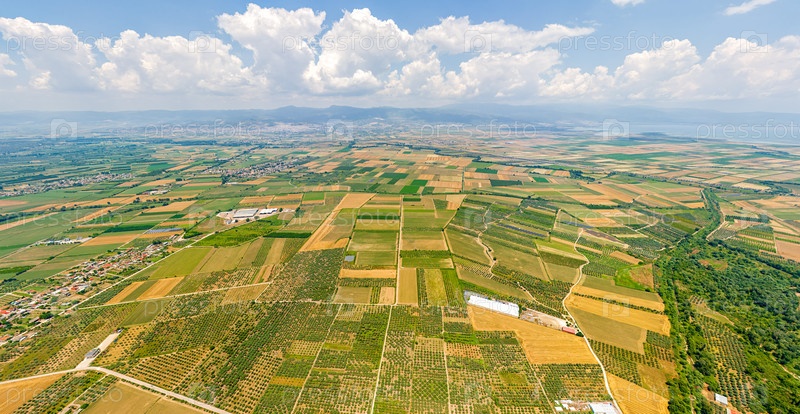 Панорама долины с полями. Оливковые деревья, красочные поля. Лето, облачная погода. Вид с воздуха