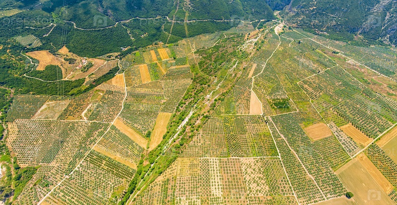 Панорама долины с полями. Оливковые деревья, красочные поля. Лето, облачная погода. Вид с воздуха