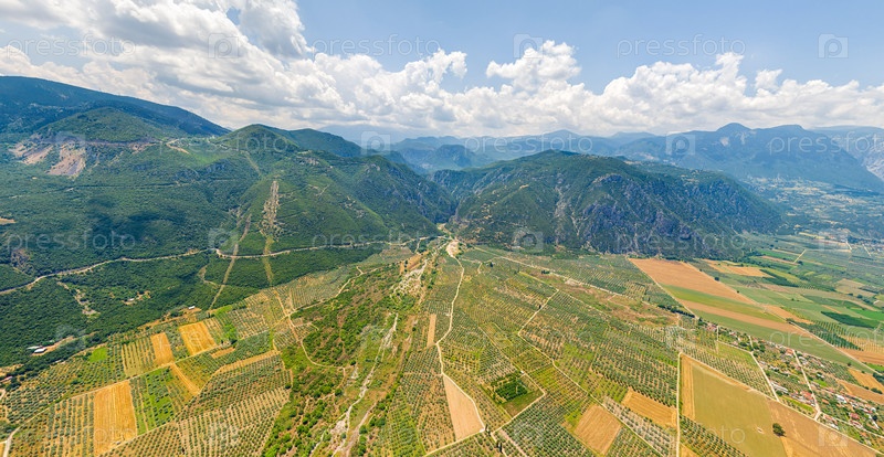Панорама долины с полями. Оливковые деревья, красочные поля. Лето, облачная погода. Вид с воздуха