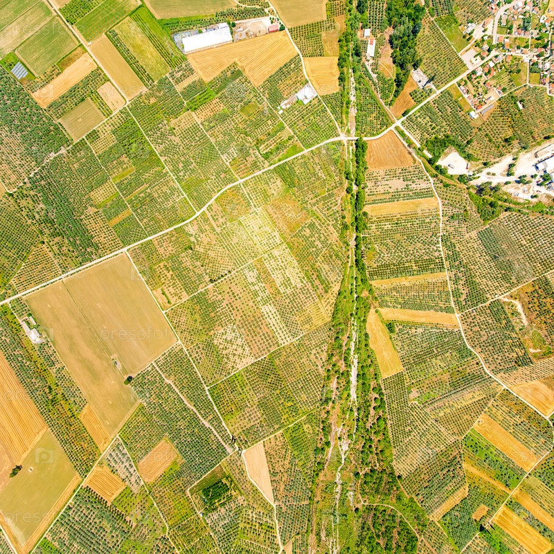Панорама долины с полями. Оливковые деревья, красочные поля. Лето, облачная погода. Вид с воздуха