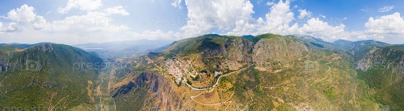 Делфы, Греция. Руины древнего города Дельфи и современный город. Вид на долину. Солнечная погода летом. Панорама 360