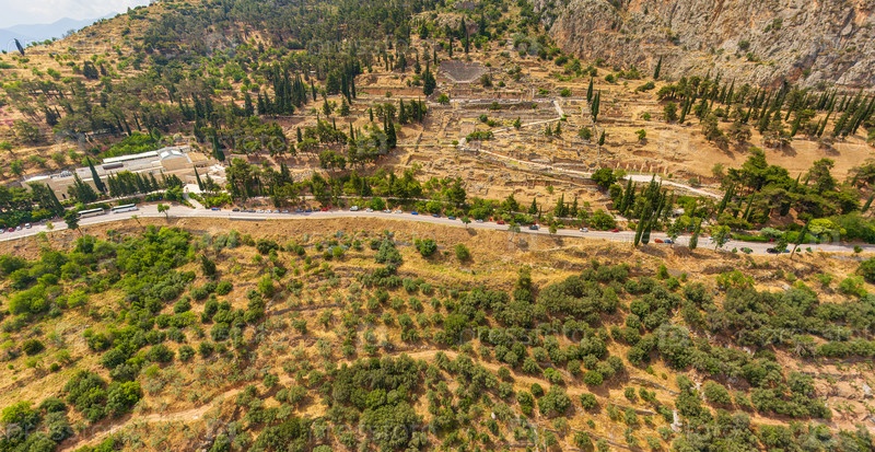 Делфи, Греция.Руины древнего города Дельфы.Солнечная погода, лето.Вид с воздуха