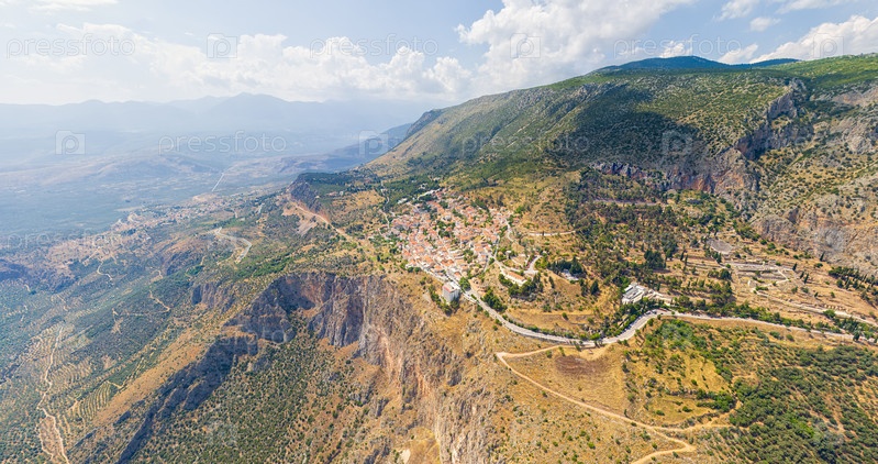 Делфы, Греция.Руины древнего города Дельфи и современного города.Вид на долину.Солнечная погода.Воздушный вид