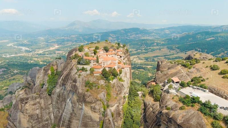 Метеора, Калабака, Греция. монастырь Преображения Спасителя. метеоры - это скалы высотой до 600 метров. ЮНЕСКО перечисляет 6 активных греческих православных монастырей Посмотреть с воздуха