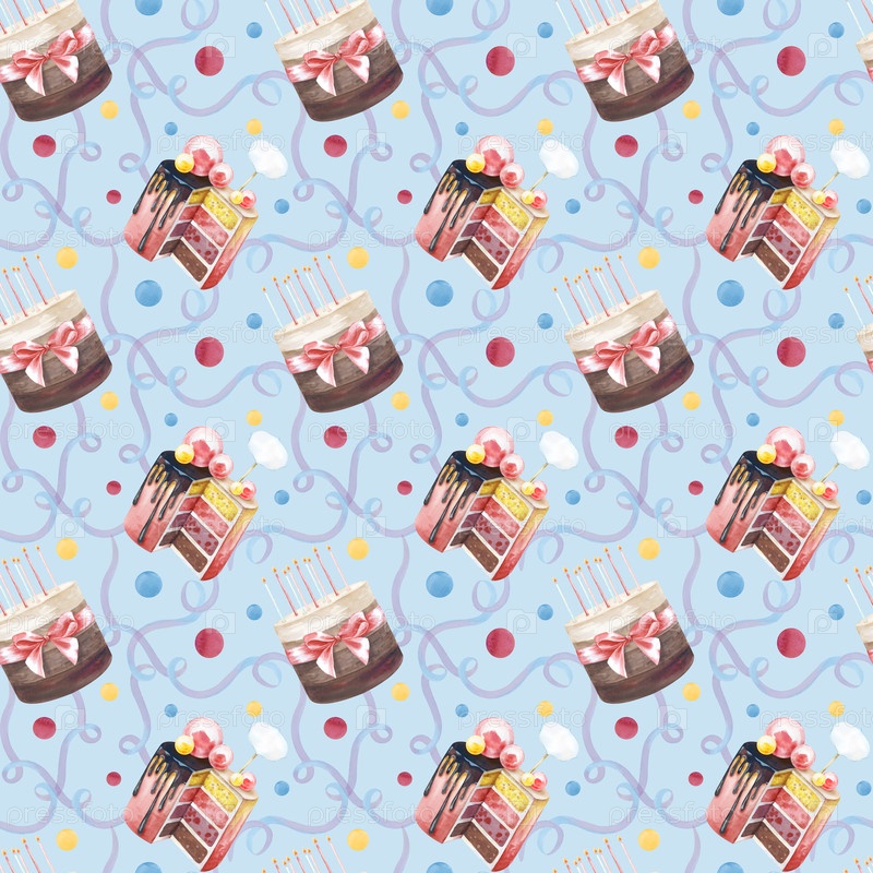 Бесшовный праздничный рисунок, нарисованный вручную. Иллюстрация акварели с тортами, свечами, ленточками, конфетти на синем фоне. Бесшовный шаблон для упаковочной бумаги, упаковки, скарапбукинга, обоев, текстиля