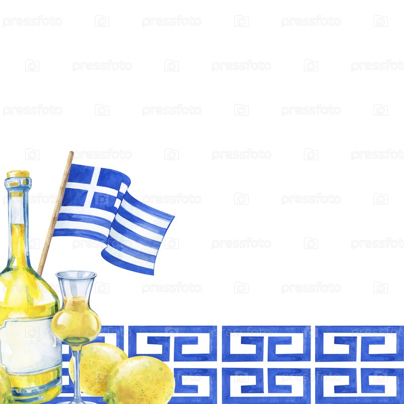 Акварельная рама с национальным напитком Греции на фоне синего орнамента.Узор со бутылкой лимончелло, стаканом и желтыми лимонами выделен на белом фоне.Илюстрация для открыток, приглашений, путевых брошюр