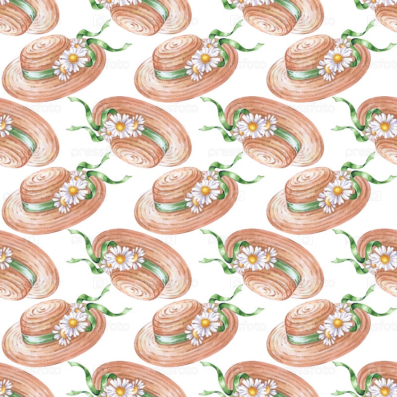Акварельный бесшовный рисунок с ручно нарисованными соломенными шляпами и ромашками с лентами. Иллюстрация на белом фоне. Красивый бесшовный фон с женским головным убором и дикими цветами для упаковки, оберточной бумаги, скарапбукинга