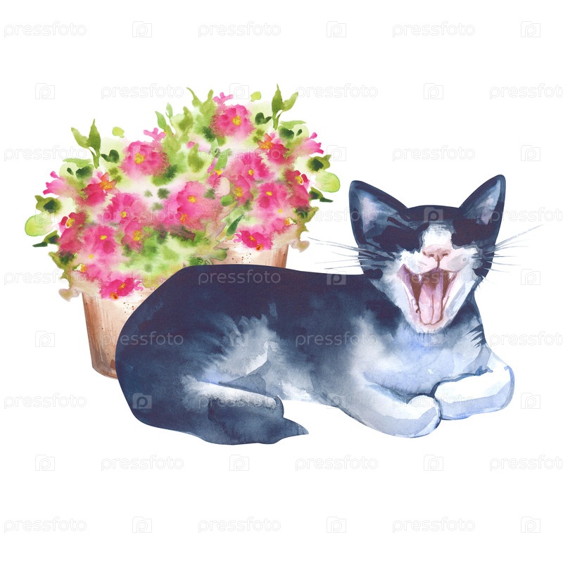 Акварельная композиция с зевающим черно-белым котом на фоне бирюзовых цветов в горшках, окрашенных вручную. Иллюстрация выделена на белом фоне. Шаблон для открыток и скарапбуков