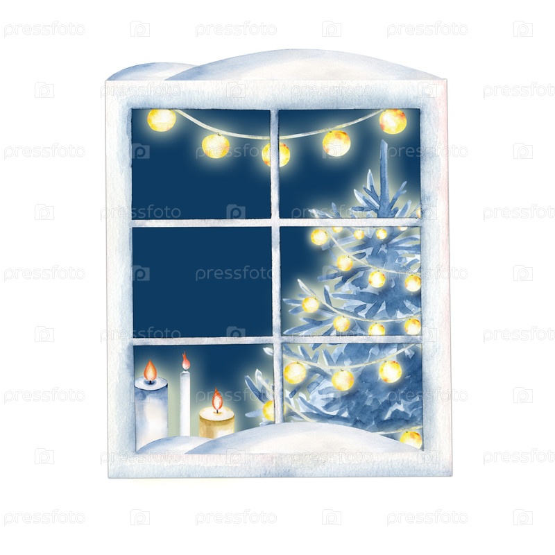 Зимнее окно с рождественской елкой, свечами и зажженной гирляндой. На окне снег. Рождество в доме. Все элементы нарисованы вручную