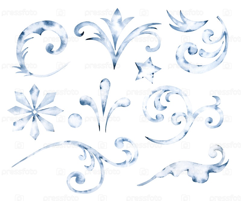Набор элементов украшения зимнего мороза, нарисованный вручную.Акварельная иллюстрация выделена на белом фоне.Серебряные формы и вихри из зимнего узора на стекле