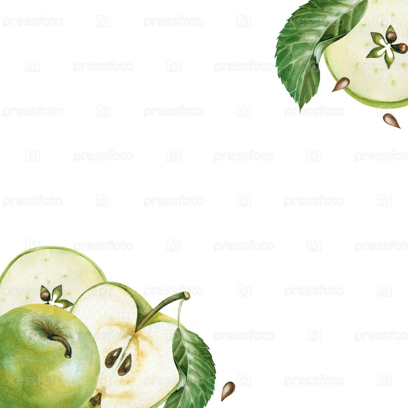 квадратная рама с зелеными яблоками, нарисованные вручную. акварельная иллюстрация со целыми и нарезанными яблоками, зелёными листьями и семенами. ботанический шаблон с копией пробела