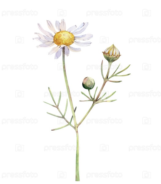 Ручная акварель Дейзи. Белый цветок с неоткрытыми почками. Ботаническая иллюстрация выделена на белом фоне. Летний дизайн