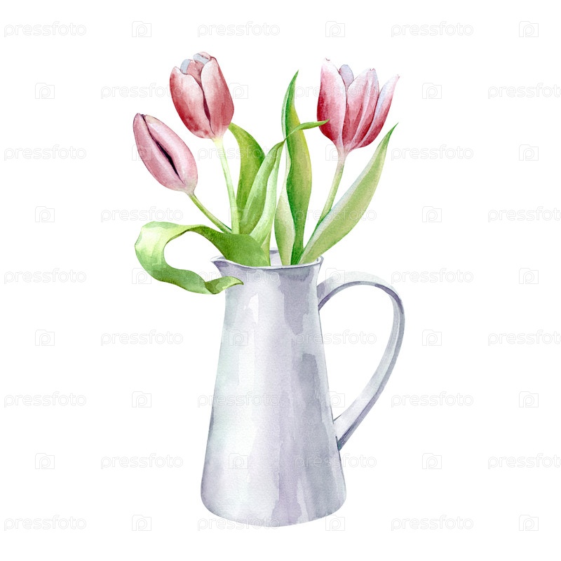 Букет розовых тюльпанов в белом кувшине нарисован вручную.Акварельная иллюстрация с весенними цветами изолирована на белом фоне.Для украшения поздравительных открыток, приглашений, свадеб, упаковки