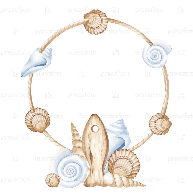 Круглая рама из жютовой веревки с различными раковинами и композицией раковин и стилизованной деревянной фигурой рыбы. Иллюстрация акварель на белом фоне. Шаблон морской темы с пустым пространством для вставки. Изолированный