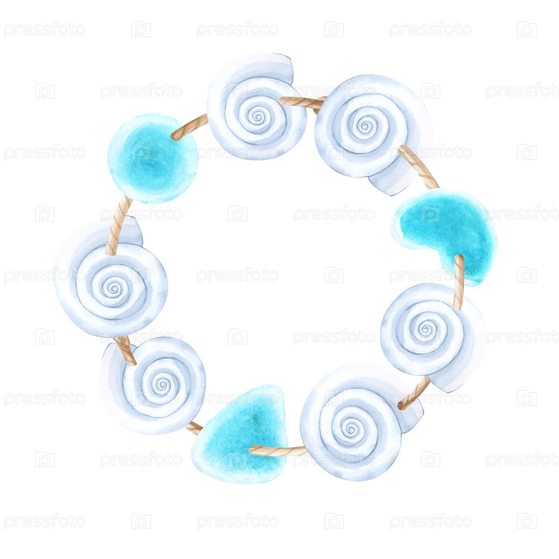 Рамка из шнура, растянутые белые ракушки и морское стекло.Илюстрация акварели выделена на белом фоне.Бордель с тематикой моря