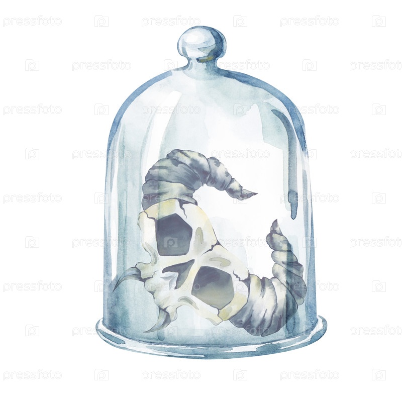 Акварельная иллюстрация с фантастическим черепом под стеклянным капюшоном на белом фоне. Стеклянный капюшон покрывает рогатый череп. Модель Хэллоуина