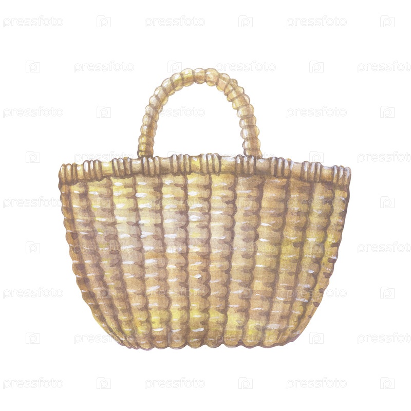 Корзина из плесеня на белом фоне написана вручную акварелью. Иллюстрация акварели. Коричневая корзина для пикника, сбор грибов и ягод. Тема садовника. Изолированная. Клипарт