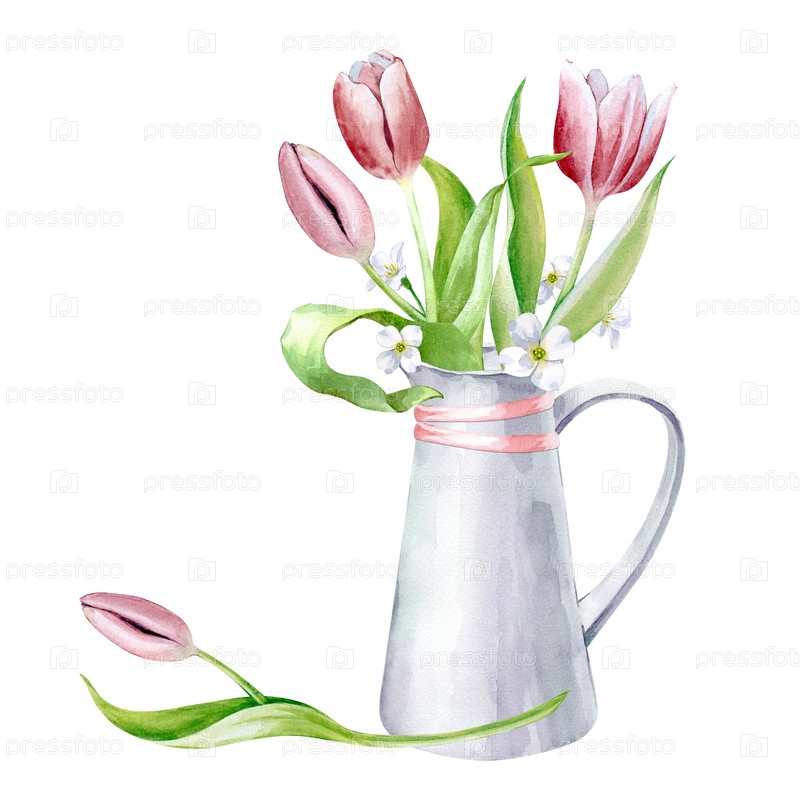 Композиция акварели с белым кувшином, розовой лентой и нежными ручными тюльпанами.Ботаническая иллюстрация.Цветочный шаблон для поздравительных открыток, свадебных приглашений