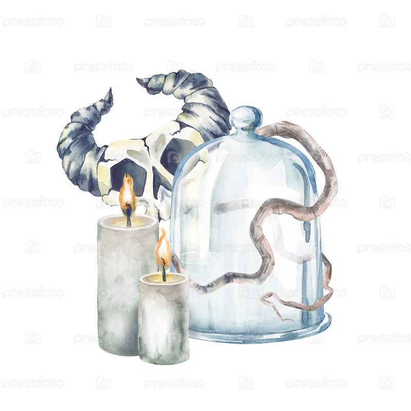 Композиция с черепом, горящими свечами и стеклянным куполом, переплетенным со изогнутыми корнями. жуткая иллюстрация с фантастическим рогатым черепом на Хэллоуин. изолированная на белом фоне