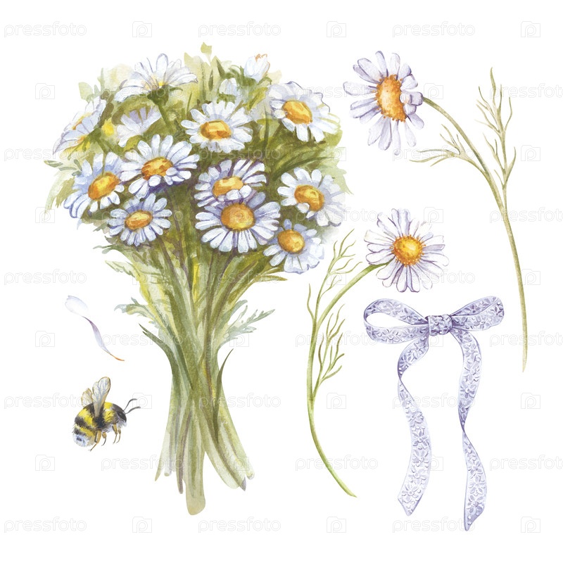 Мини-сет с окрашенными ромашками на белом фоне. Иллюстрация акварели с полевыми цветами, букетом, насекомыми, кружевным луком. Цветочный клипарт для украшения поздравлений, свадеб, приглашений