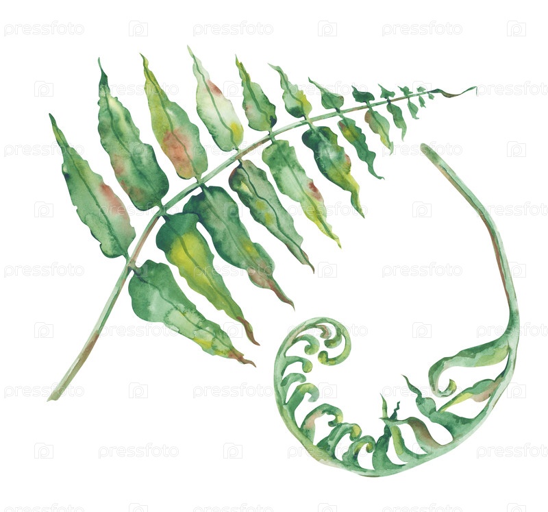 Два листа папоротника вручную нарисованы на белом фоне. Иллюстрация акварельной краской зеленых листьев лесного растения. Изолированный. Ботанический элемент для украшения открыток, приглашений, обоев и упаковки. Лесная тема
