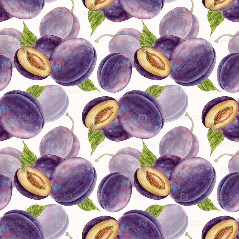 Бесшовный акварельный рисунок с целыми и наполовину сливными плодами и зелеными листьями. Ботаническая иллюстрация спелых фруктов на белом фоне. Шаблон для записей, упаковки и обоев