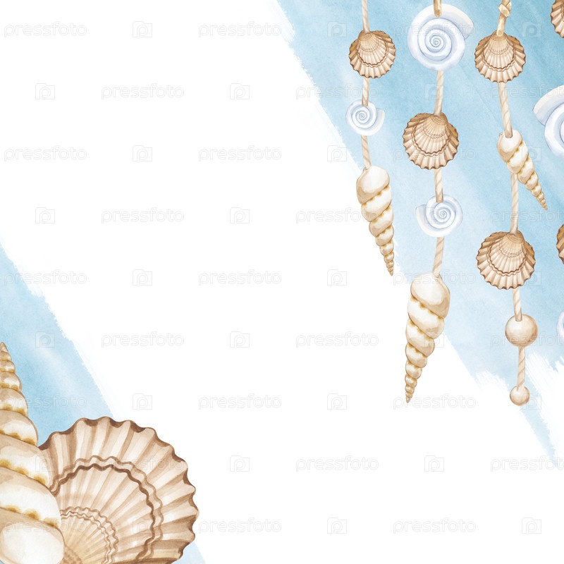 Квадратная рамка акварели с раковинами и красочное пятно синей акварели. Шаблон в морской тематике. Пустое место для вставки. Для регистрации визитных карточек, открыток, приглашений