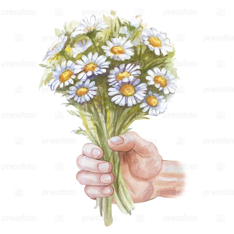 Букет ромашки в руке мужчины на белом фоне. Иллюстрация акварели. Белые дикие цветы. Поздравления. Изоляции. Для открыток
