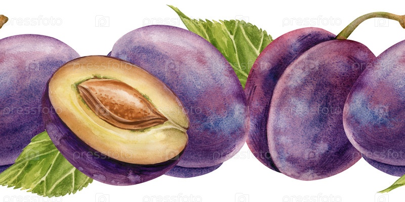Горизонтальная бесшовная граница с акварельной сливой и зелеными листьями на белом фоне. Акварельная иллюстрация сладкого спелого фрукта. Изолированный. Баннер для разработки меню, рецептов и этикетки. Уборка плодов