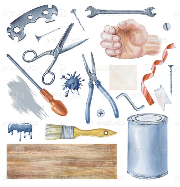 акварельный набор мужских рабочих инструментов на белом фоне. акварельная иллюстрация сильной человеческой руки и рабочего оборудования для ремонта дома. изолированный. День отца