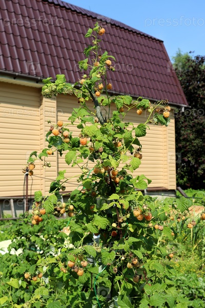 Желтый малиновый куст с ягодами на фоне сельского дома и неба в солнечный летний день