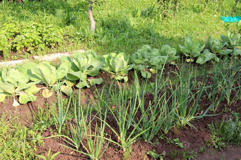 Кровать с созревающей белой капустой и зеленым луком в саду в солнечный летний день