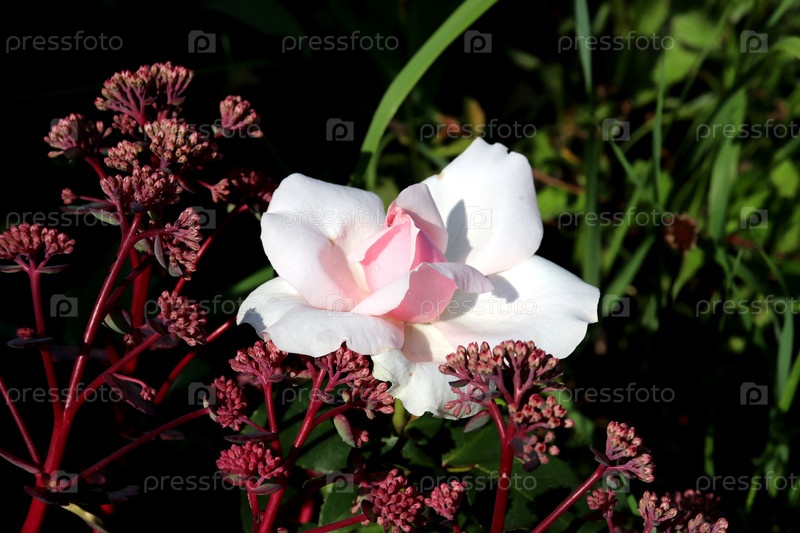 Бело-розовая роза с красным пятном на фоне травы в солнечном свете летнего дня