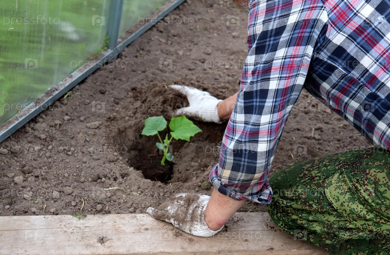 Фермер сажает рассаду огурцов в яму и заполняет растение землей в теплице
