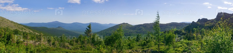 Панорамный горный пейзаж с зелеными лесами и голубым небом.Урал, Россия