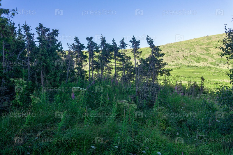 Вечерний горный лес с карликовыми деревьями на Северном Урале