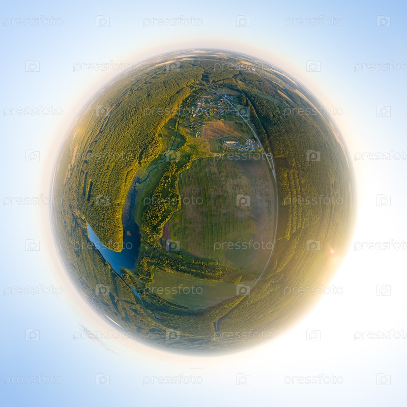 Екатеринбург, Россия. ландшафт леса с полями и деревнями. болотный пруд. время заката солнца. 360-градусная панорама астероида