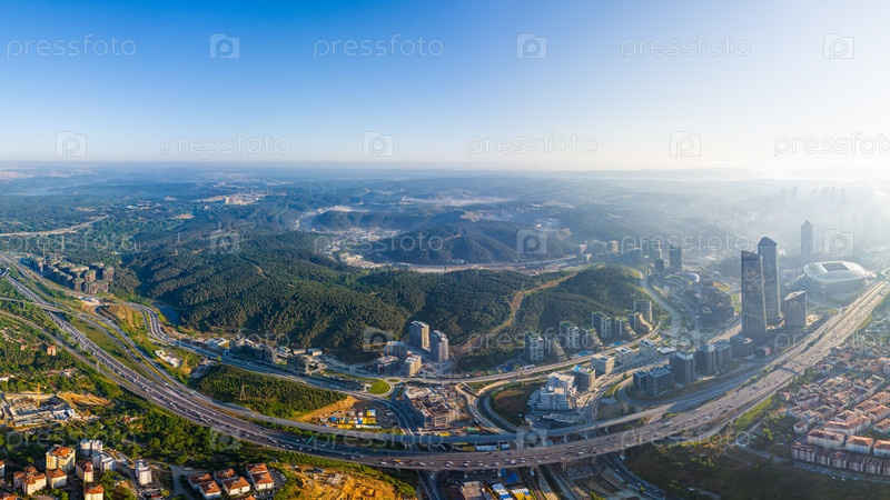 Стамбул, Турция.Панорама города сегодня утром.Небоскребы и жилые районы.Шоссе.Вид с воздуха