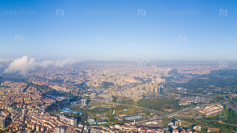 Стамбул, Турция. Панорама города сегодня утром. Жилые районы. Автомагистраль. Парки. Вид с воздуха