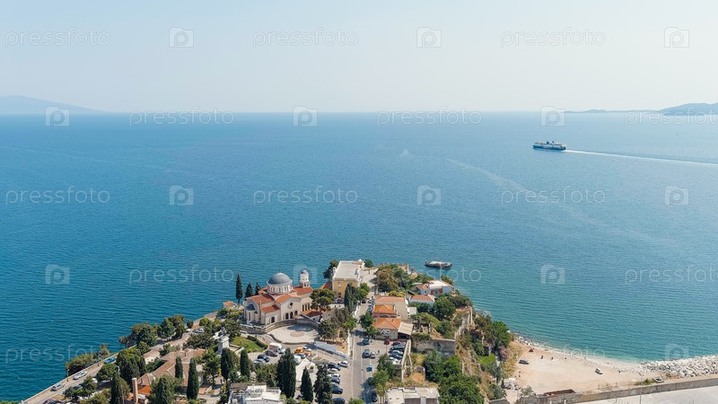 Кавала, Греция. Крепость Кавала. Паром покидает порт. Исторический центр города. Лето, вид с воздуха