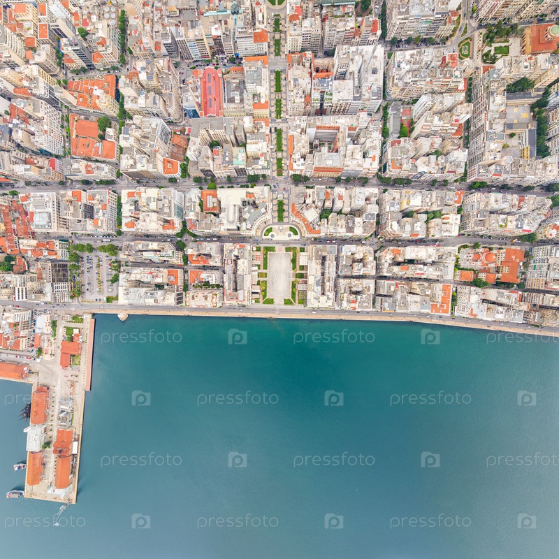 Салоники, Греция. Панорама города и порта. Облачная погода. Вид с воздуха