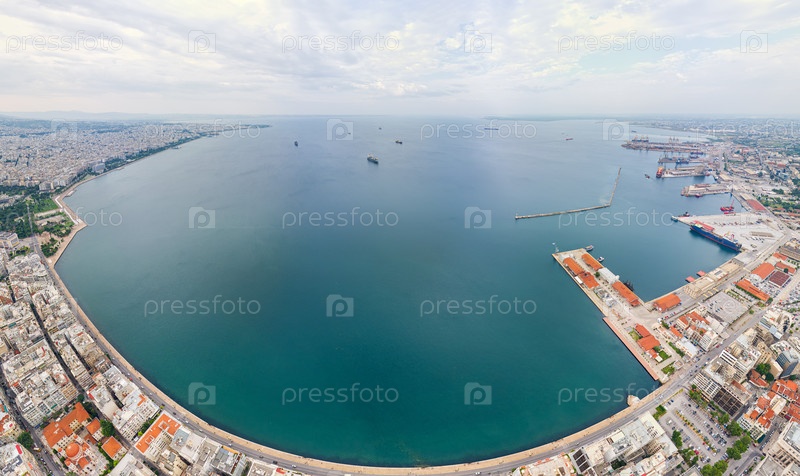Салоники, Греция. Панорама города и порта. Облачная погода. Вид с воздуха