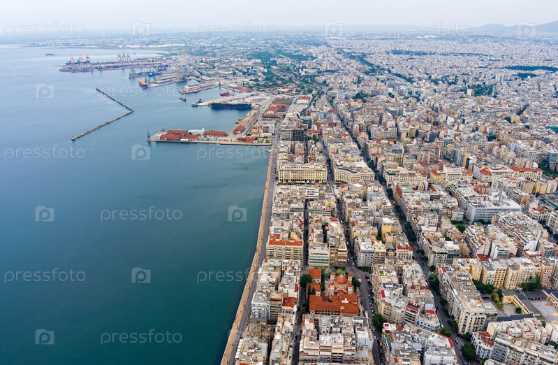 Салоники, Греция. Панорама города и порта. Облачная погода. Вид с воздуха