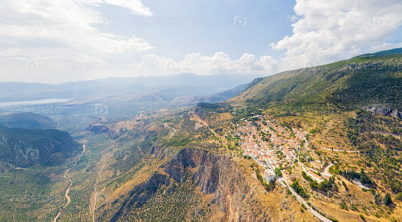 Делфи, Греция.Современный город.Вид на долину.Солнечная погода.Воздушный вид