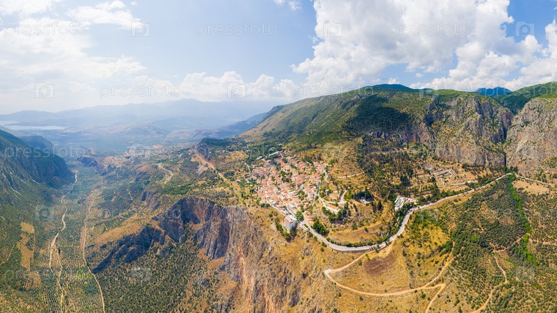 Делфы, Греция.Руины древнего города Дельфи и современного города.Вид на долину.Солнечная погода.Воздушный вид