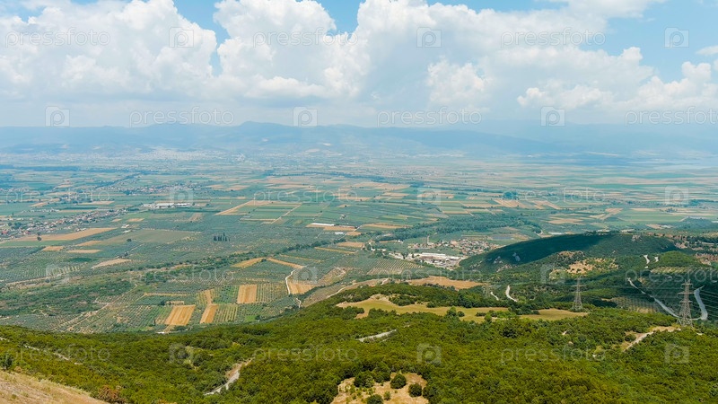 Панорама долины с полями. Оливковые деревья, красочные поля. Лето, пасмурная погода, вид из воздуха