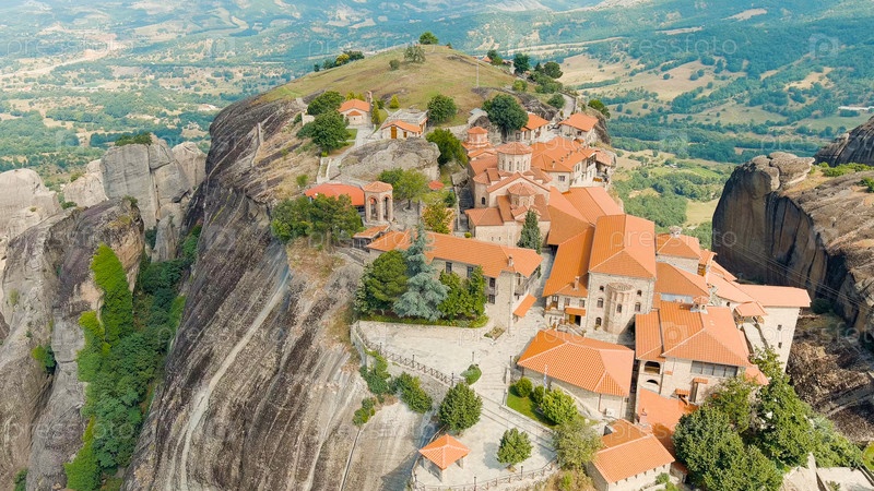 Метеора, Калабака, Греция. монастырь Преображения Спасителя. метеоры - это скалы высотой до 600 метров. ЮНЕСКО перечисляет 6 активных греческих православных монастырей Посмотреть с воздуха
